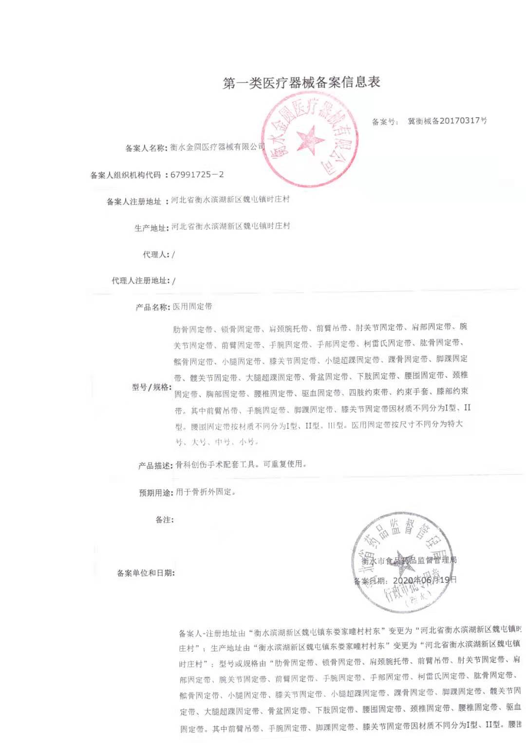 衡水金圆医疗器械有限公司,座落于风景秀丽的自然保护区衡水湖畔,北邻京九铁路、石徳铁路,西临106国道,地理位置优越,交利。公司研发各类护理器具、医疗保健用品,目前在衡水市医疗器械品种齐全,规模较大的厂家。 主要产品有:自发热运动护具、医用固定带、腹带、各种医用拐、多功能护理床、产床、高分子支具、骨折固定夹板、夹板、弹力网状绷带帽等。